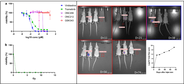 在进行细胞毒性测定实验发现PDCL对患者接受的治疗(长春碱、曲美替尼、放疗)敏感,但对于DRD调节剂药物ONC206、ONC212和EZH2抑制剂GSK343药物敏感性较低。在PDX模型中出现了PDCL样本相似的敏感性特征。