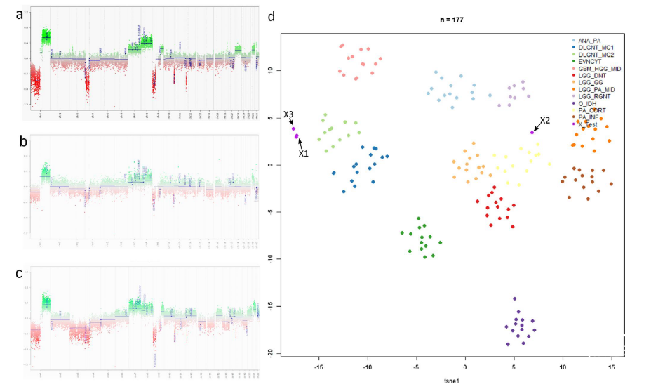本文介绍一例儿童患者因Dandy-Walker 综合症接受手术治疗,初步诊断是毛细胞星形细胞瘤伴软脑膜转移,根据SIOP-LGG 2004 方案进行治疗,治疗期间MRI显示部分反应,直至85周没有进展。停止治疗后8个月影像学显示疾病进展,同时伴有脑膜转移。活检样本免疫组化结果显示:GFAP、P53、ATRX、S100、突触素等表达阳性,Ki67为80%-90%。同时检出有1p36.3拷贝数缺失和KIAA1549-BRAF融合,但没有检出19q3.3拷贝数缺失,NGS检测结果未发现其他基因变异。肿瘤的甲基化阵列分析结果显示DLGNT MC-2亚型。在接受长春碱单药治疗后出现疾病进展,后采用放射治疗,MRI显示部分反应并在治疗后7个月内疾病稳定。随后出现腹水等提示大网膜转移,同时出现髂骨和股骨病变,免疫组化结果显示MAP2、S100和突触素阳性,提示DLGNT转移。再次进行药物治疗(长春碱、曲美替尼),治疗3周后死亡。