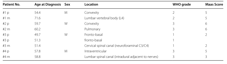 最近的一篇研究对5例颅外转移性脑膜瘤及其原发肿瘤的临床及分子突变特征进行了分析[7]。分子突变分析图谱显示,在这5名患者中有4名患者的颅外转移性脑膜瘤与原发病灶出现了相同或重叠的基因突变,这证实了颅外病灶是颅内转移而来,另1名患者的颅内和颅外病灶出现了不同的基因突变,因此被认为是各自独立的肿瘤并在后续的分析中被排除。在对这4名颅外转移性脑膜瘤的基因图谱分子中发现,其中3名患者的原发颅内病灶和颅外转移肿瘤均包含BAP1基因突变,另1名患者被诊断患有BAP1肿瘤易感综合征。BAP1突变方式主要包括移码突变、过早终止突变和拷贝数改变,并且BAP1突变WHO 1-3级中均有分布(表1)。