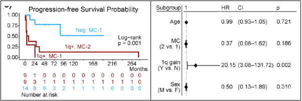 从队列中的PFS结果分析证实1q染色体拷贝数缺失与预后差相关,这个相关性与甲基化分型无关。通过对其进行进一步的多变量Cox回归分析也进一步证明这一结论,且发现与没有发生1q拷贝数缺失的样本相比,发生缺失的样本出现进展的可能性高出约20倍。