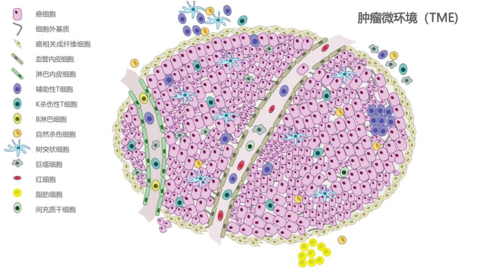 免疫治疗时代,无数患者在免疫治疗的干预下取得了显著疗效,但仍有一部分患者对于免疫治疗的响应不理想。免疫治疗的最终效果起效主要发生在肿瘤微环境中(浸润、识别、杀伤),随着技术的进步,我们逐渐了解了肿瘤免疫微环境的复杂性和多样性,认识到它对免疫治疗的重要影响。肿瘤微环境(Tumor Microenvironment, TME)的组成已被证实会影响机体对ICB的应答。TME 由肿瘤细胞及其周围的免疫细胞、肿瘤相关成纤维细胞、血管内皮细胞、淋巴管等构成(图 1),其中免疫应答相关成分又被称作肿瘤免疫微环境(Tumor Immune Microenvironment, TIME)。目前,TIME 中肿瘤细胞和/或免疫细胞表面重要生物标志物 PD-1/PD-L1 被认为与 ICB 应答有关,基于免疫组化的 PD-L1 检测是唯一获得 FDA 批准的用于 ICB 治疗非小细胞肺癌(NSCLC)、胃癌、肝癌、尿路上皮癌、宫颈癌和三阴性乳腺癌的伴随诊断。除了 PD-L1,越来越多的数据表明 TIME 中免疫细胞及其表面其它重要生物标志物在指导患者药物选择和预后评估方面也具有重要意义。