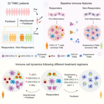 研究人员通过单细胞测序和多重荧光免疫组化技术(mIHC)检查了22 名接受紫杉醇或其与抗 PD-L1 atezolizumab 联合治疗的晚期 TNBC 患者的免疫细胞动力学。研究结果表明,高水平的基线 CXCL13 + T 细胞与巨噬细胞的促炎特征有关,并且可以预测对联合治疗的有效反应。在有反应的患者中,淋巴组织诱导 (LTi) 细胞、滤泡 B (Bfoc) 细胞、CXCL13 +T 细胞和常规 1 型树突状细胞 (cDC1) 在联合治疗后协同增加,但在紫杉醇单药治疗后反而减少。