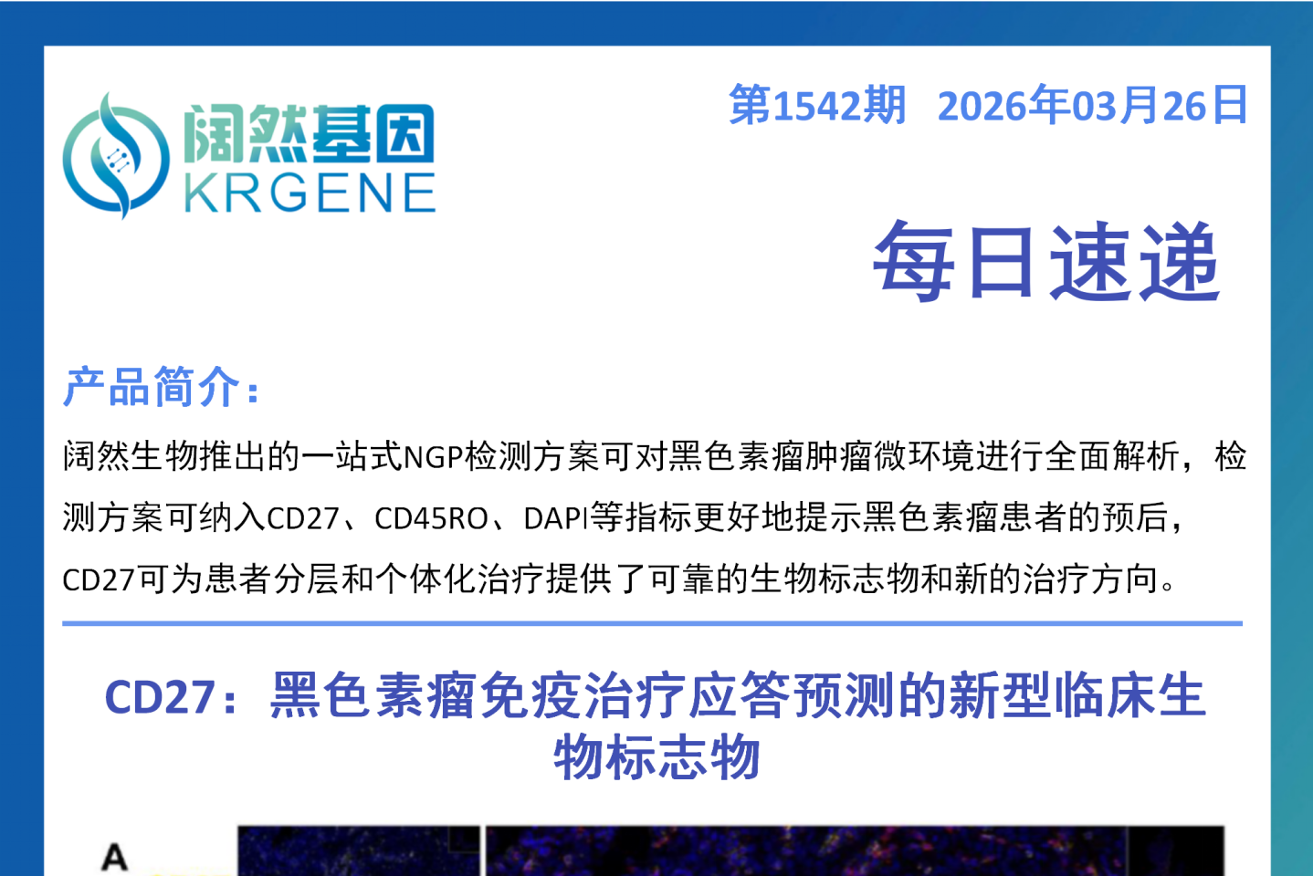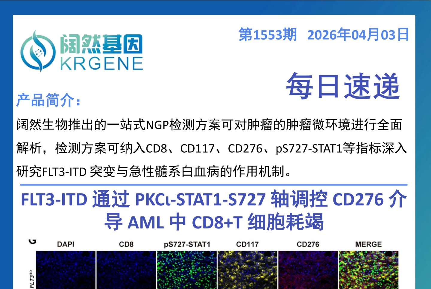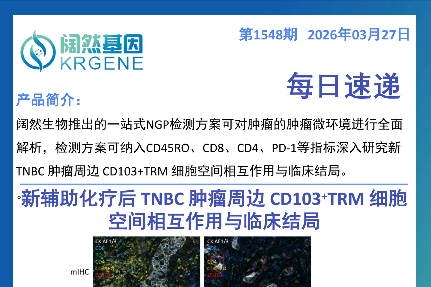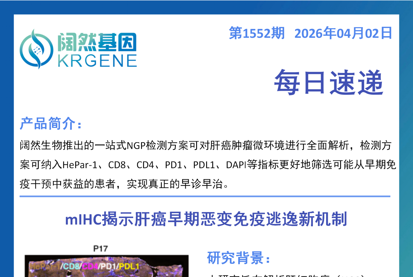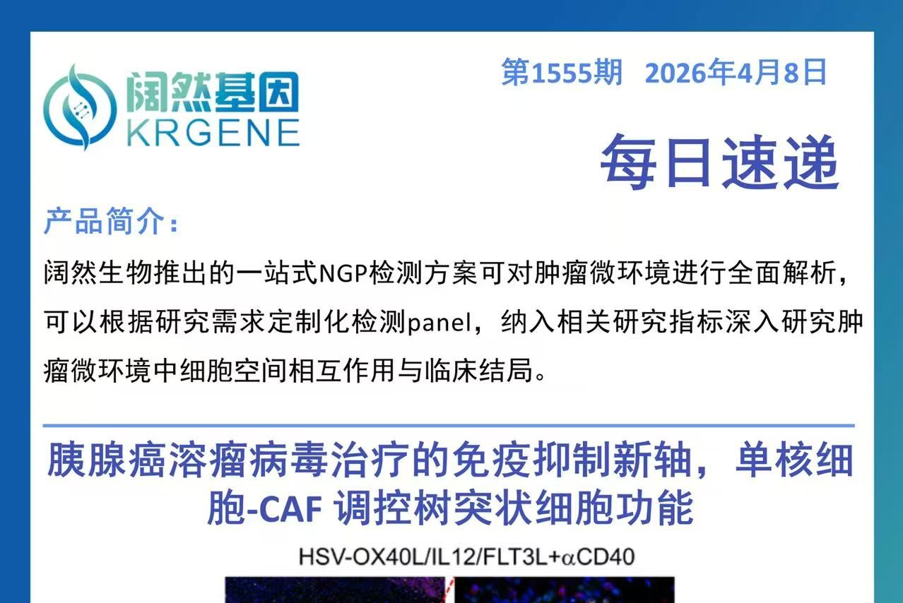 一、研究主题 聚焦胰腺导管腺癌溶瘤病毒治疗的免疫抑制机制,首次发现IL-1β⁺单核细胞 - IL-6⁺CAF 免疫抑制轴对树突状细胞的调控作用,验证工程化溶瘤病毒联合 CD40 激动抗体的治疗策略,并凸显多重荧光免疫组化技术在肿瘤微环境解析中的核心应用价值。 二、核心临床价值 填补机制空白:明确胰腺癌溶瘤病毒治疗耐药的全新分子机制,为后续靶向阻断免疫抑制通路提供理论依据。 提供新治疗策略:研发的工程化溶瘤疱疹病毒联合 CD40 激动抗体方案,可恢复树突状细胞功能、激活肿瘤特异性 T 细胞,为胰腺癌难治性免疫治疗提供转化方向。 验证技术临床价值:确立多重荧光免疫组化在解析肿瘤微环境免疫细胞空间互作的应用价值,为免疫治疗疗效评估提供可视化检测手段。 三、检测方案与临床落地应用 以多重荧光免疫组化为核心检测方案,通过标记 CD11c+DC、CD3+T、CD19+B 等标志物,直观呈现肿瘤内免疫细胞的空间分布与簇状互作特征;该技术可落地于胰腺癌患者肿瘤组织检测,辅助评估免疫细胞活化状态、预测免疫治疗应答,也可用于治疗后微环境的动态监测。 四、行动建议 临床研究可将 IL-1β/IL-6 通路作为胰腺癌溶瘤病毒治疗的潜在靶点,开展通路阻断与溶瘤病毒联合的临床探索。 推广多重荧光免疫组化在胰腺癌肿瘤微环境检测中的常规应用,助力个体化免疫治疗方案制定。 加快工程化溶瘤病毒联合 CD40 激动抗体的临床转化,完善给药方案并评估其安全性与有效性。 五、一句话总结 本研究发现胰腺癌溶瘤病毒治疗的 IL-1β⁺单核细胞 - IL-6⁺CAF 免疫抑制轴,证实了工程化溶瘤病毒联合 CD40 激动抗体的治疗潜力,同时凸显多重荧光免疫组化技术在肿瘤微环境解析中的关键作用,为胰腺癌免疫治疗提供了新机制、新策略和新技术支撑。 十大滚球体育app Shanghai KR Pharmtech, Co., Ltd.